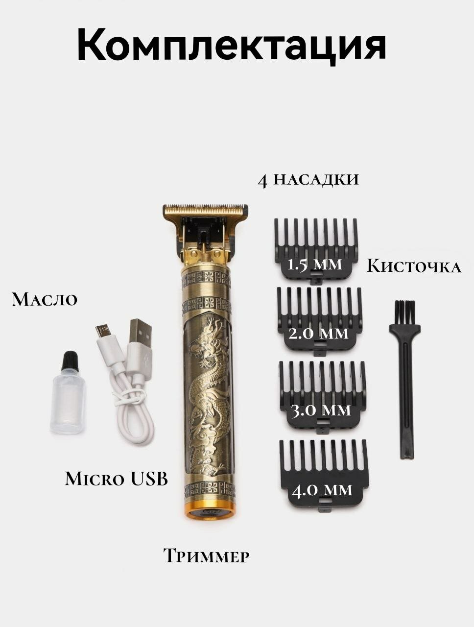 | В комплекте | кабель USB / кабель для зарядки / масло / насадка для бороды / щеточка |