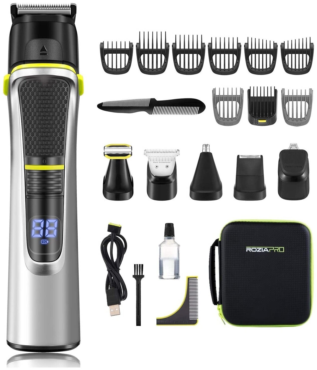 | В комплекте | кабель USB / кабель для зарядки / масло / насадка для бороды / насадка для носа / насадка для стрижки волос в носу / насадка для ушей / расческа / сумка для хранения / щеточка |