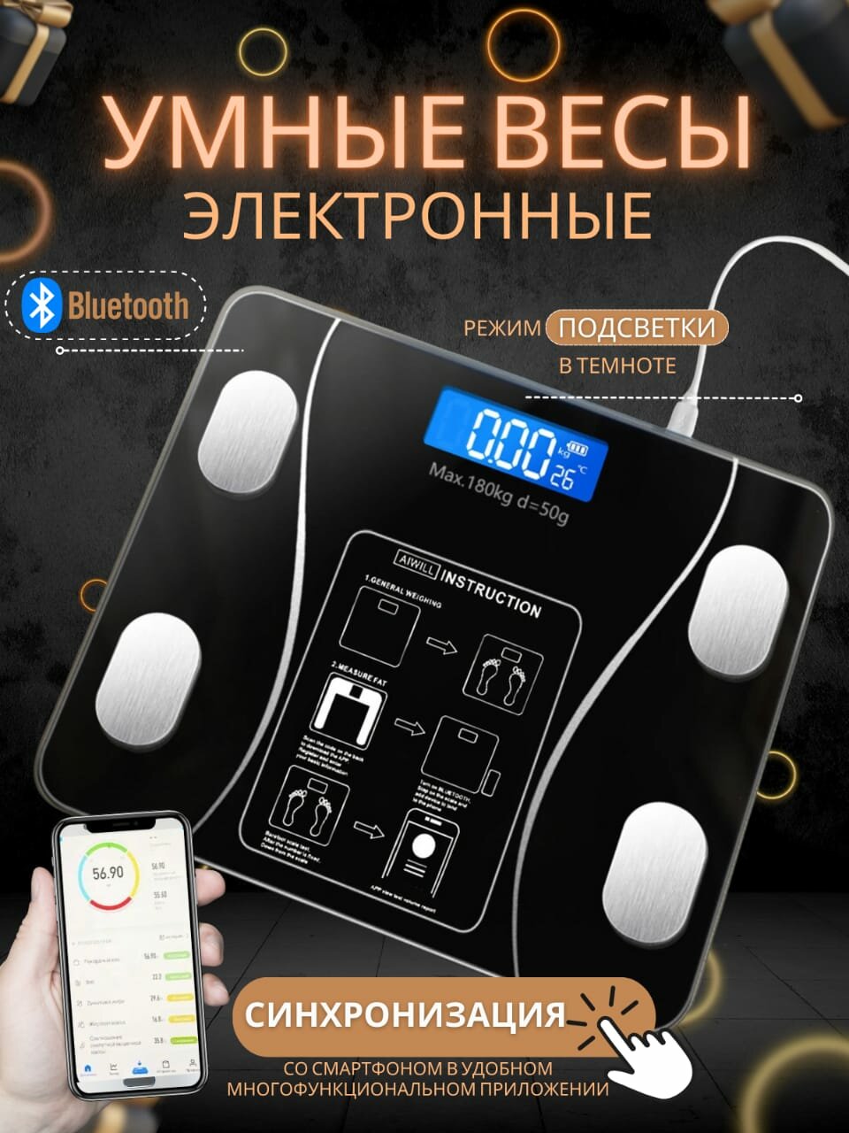 Напольные умные весы с расчётом 12 показателей качества тела совместимые для Android, IOS , черные
