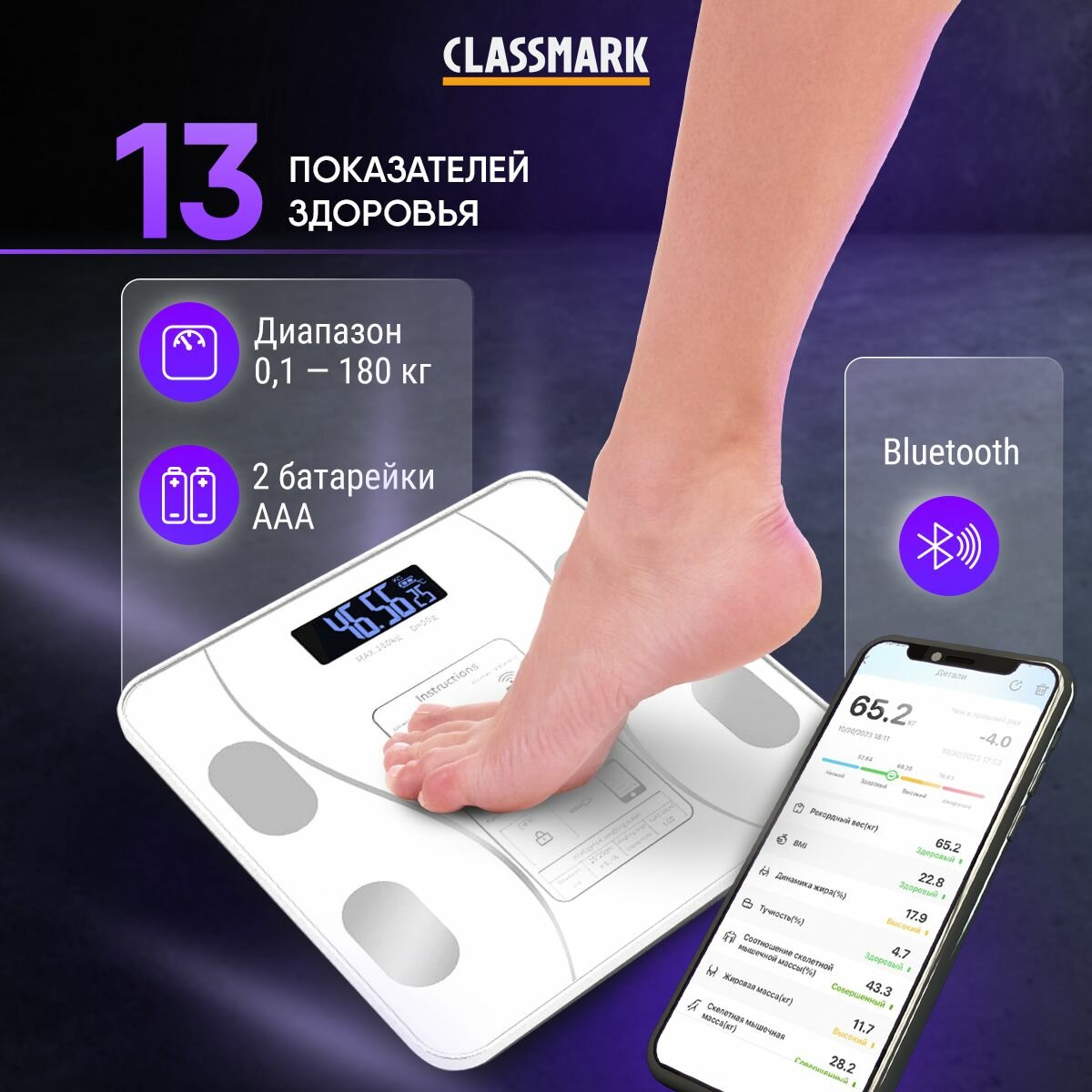 Отзывы на Весы напольные электронные умные с приложением Classmark до 180 кг точные, LCD-дисплей и bluetooth, стильные для дома, с индексом массы жира и белка, автоматическое отключение, белые