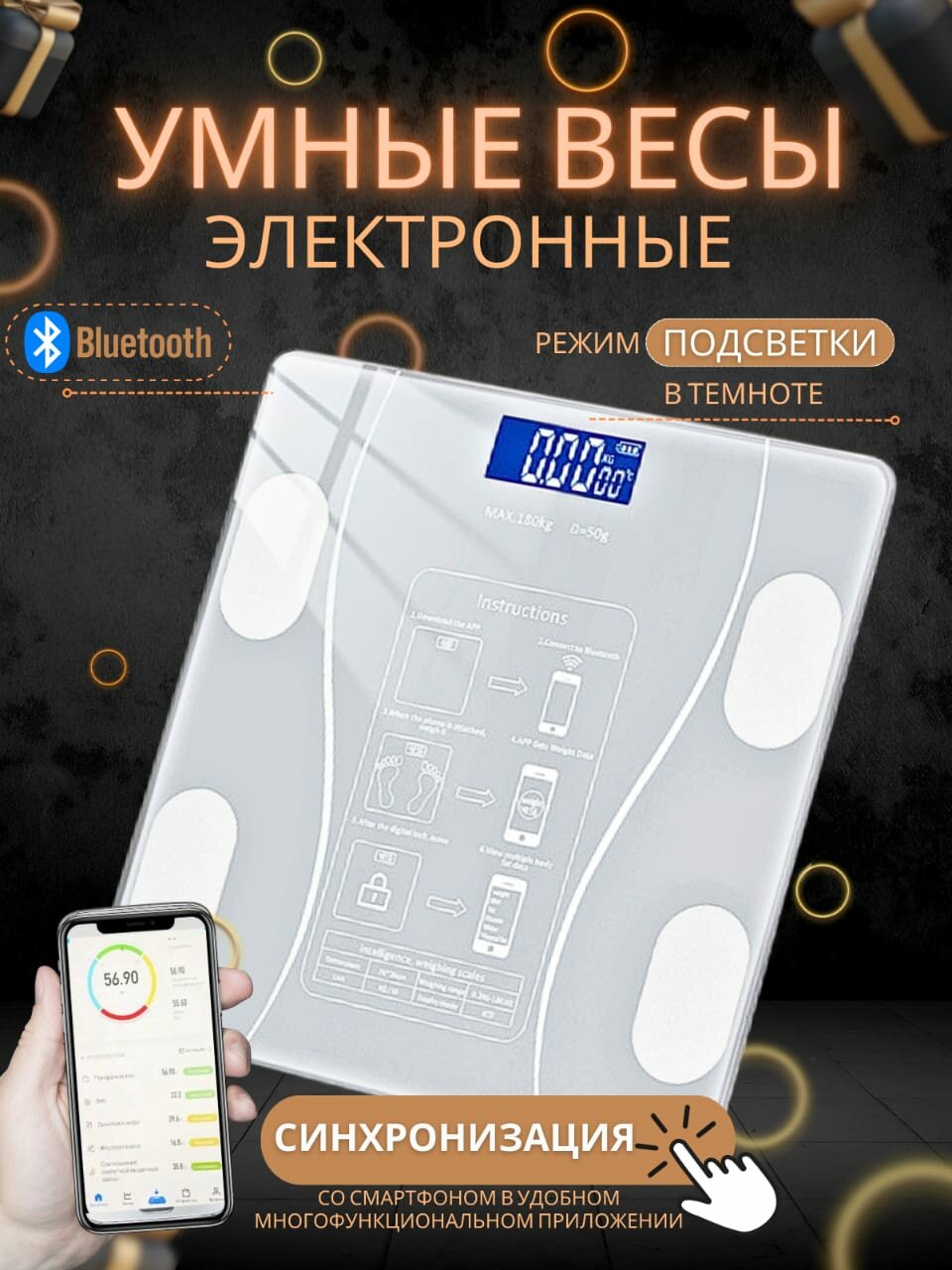 Напольные умные весы с расчётом 12 показателей качества тела совместимые для Android, IOS , черные