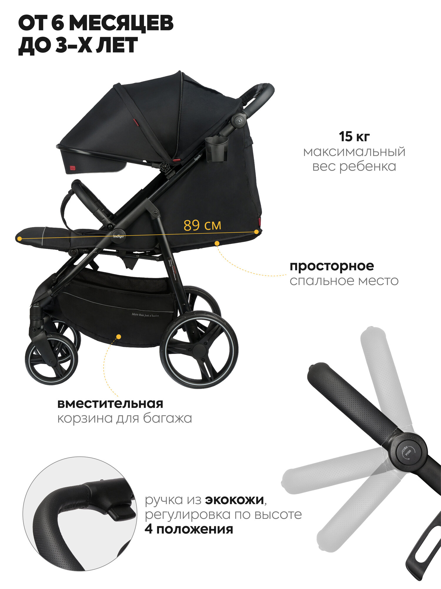 Коляска прогулочная Indigo Spark всесезонная, черный информация: