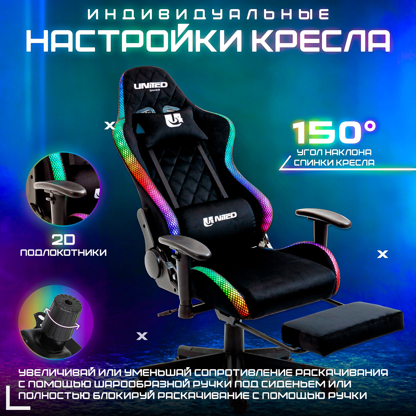10 цен на Кресло компьютерное UNITED GAMER BLACK LIGHT, RGB-подсветка, подставка для ног, черный велюр