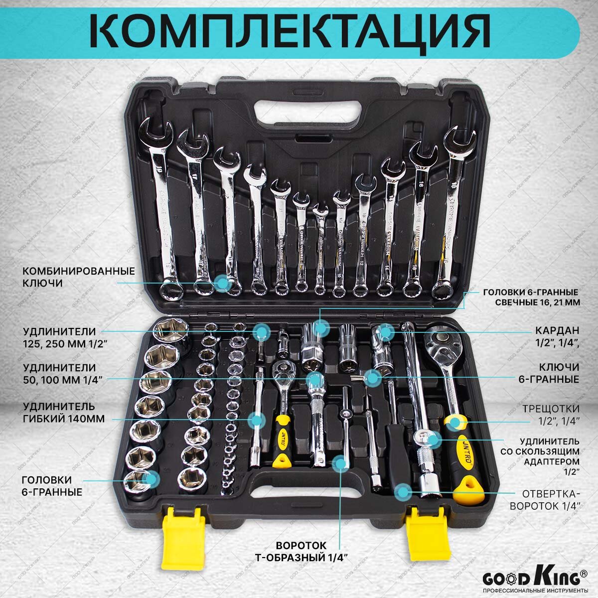 | Дополнительная информация | ТОРЦЕВЫЕ ГОЛОВКИ И ПРИНАДЛЕЖНОСТИ 1/2": Головки 6-гранные - 10, 11, 12, 13, 14, 15, 16, 17, 18, 19, 20, 21,22,23, 24,27,30 , 32мм - 18 шт; Головки 6-гранные свечные - 16, 21 мм - 2 шт; Удлинители - 125, 250 мм - 2 шт; Трещотка - 250 мм, 24 зубца - 1 шт; Кардан - 75 мм - 1 шт; Скользящий адаптер - 1/2" x 3/8" - 1 шт; ТОРЦЕВЫЕ ГОЛОВКИ И ПРИНАДЛЕЖНОСТИ 1/4": Головки 6-гранные - 4, 4.5, 5, 5.5, 6, 7, 8, 9, 10, 11, 12, 13, 14 мм - 13 шт; Удлинители - 50, 100 мм - 2 шт; Удлинитель гибкий - 140 мм - 1 шт; Трещотка - 160 мм, 24 зубца - 1 шт; Вороток Т-образный - 115 мм - 1 шт; Отвертка-вороток - 150 мм - 1 шт; Кардан - 40мм - 1 шт; КЛЮЧИ: Ключи комбинированные - 8, 9, 10, 11, 12,13, 14, 15, 16,17, 18, 19 мм - 12 шт; Ключи шестигранные укороченные - 1.5, 2, 2.5 мм - 3 шт; Система хранения инструмента: Кейс - Полиуритан пластик - 1 шт; |