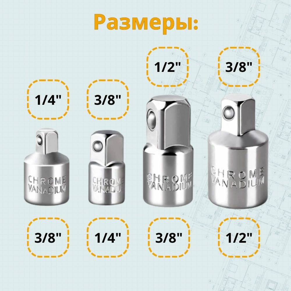 Набор переходников адаптеров для головок 1/2, 3/8 и 1/4" 4 предмета информация: