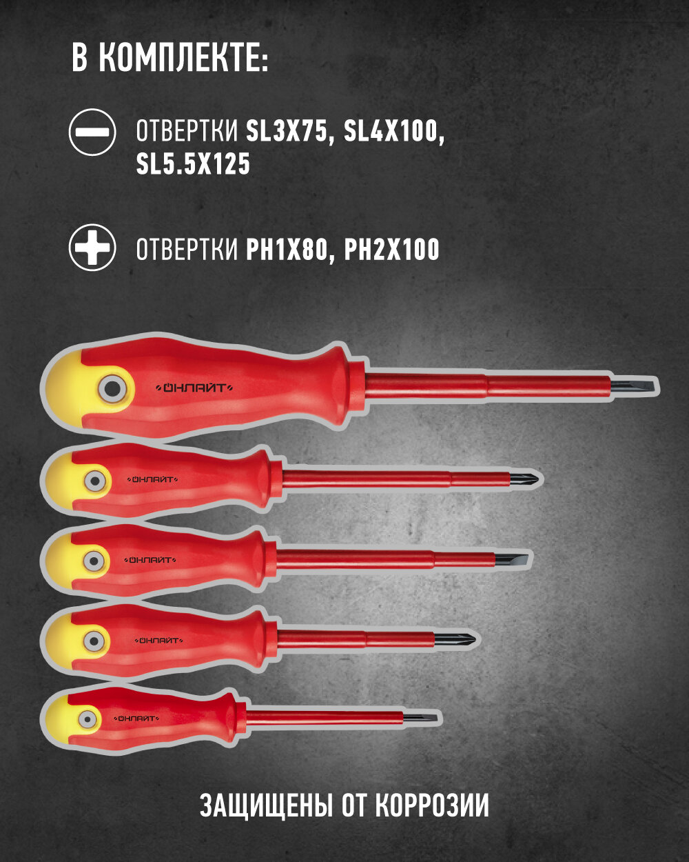 Набор отверток диэлектрических онлайт 90 355, крестовые и шлицевые, 5 шт информация: