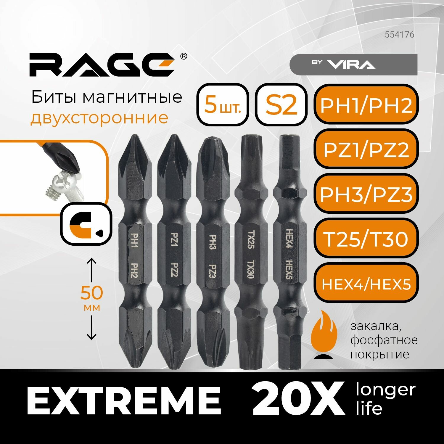 RAGE by VIRA Набор бит двухсторонних s2 ph1xph2, pz1xpz2, ph3хpz3, tx25xtx30, hex4xhex5x50 мм 5 шт 554176 516 ₽