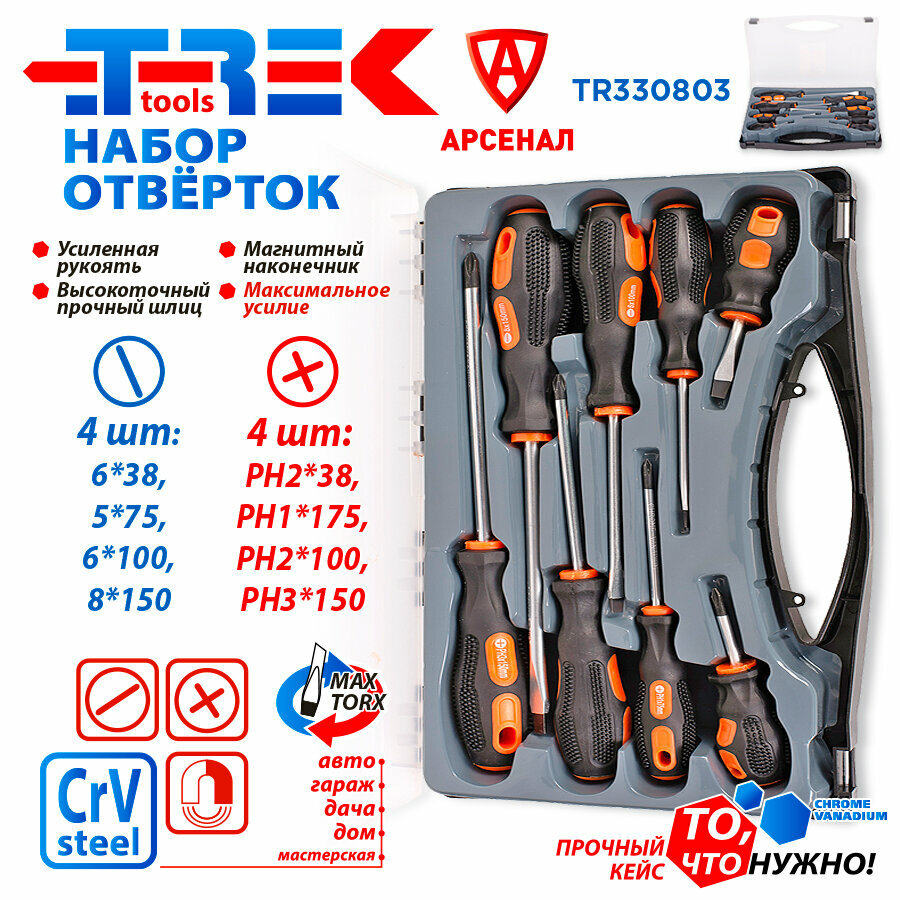 10 цен на Набор отверток TREK 8 штук (4 шлиц.+ 4 крест.) в кейсе, TR330803
