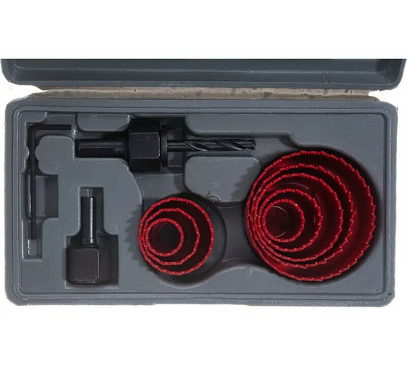 | Дополнительная информация | набор цельнометаллических коронок по дереву:кольцевая пила из углеродистой стали-8 шт.шестигранный ключ-1шт.оправки-2шт.зубья разведены и заточены. |