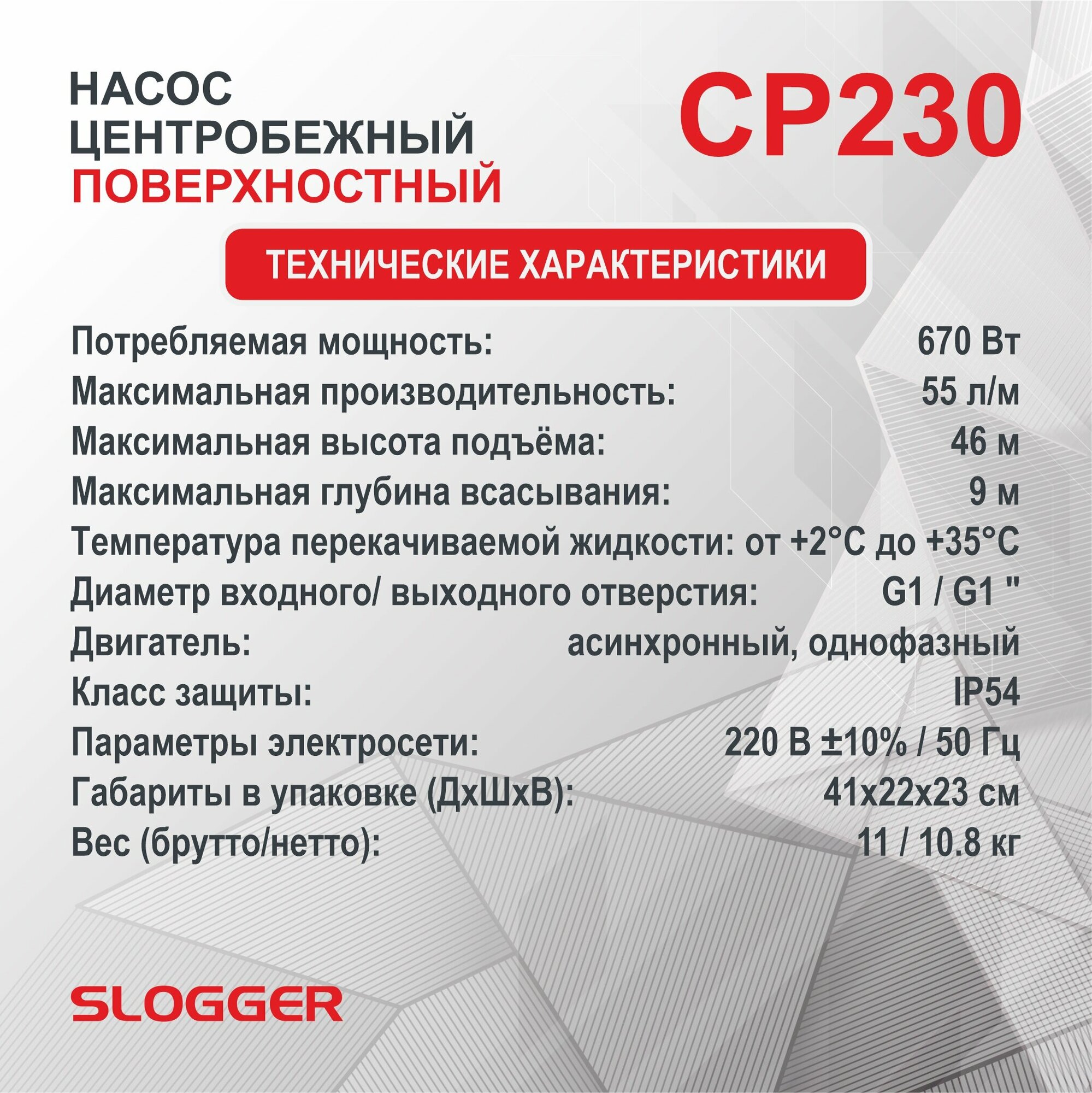 Насос поверхностный самовсасывающий SLOGGER CP230 информация:
