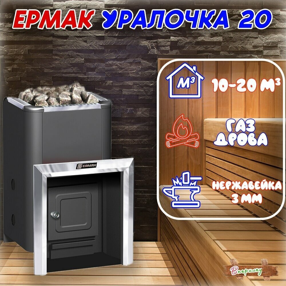 Печь банная газо-дровяная Ермак Уралочка 20 Н нержавейка с автоматикой 20 кВт информация: