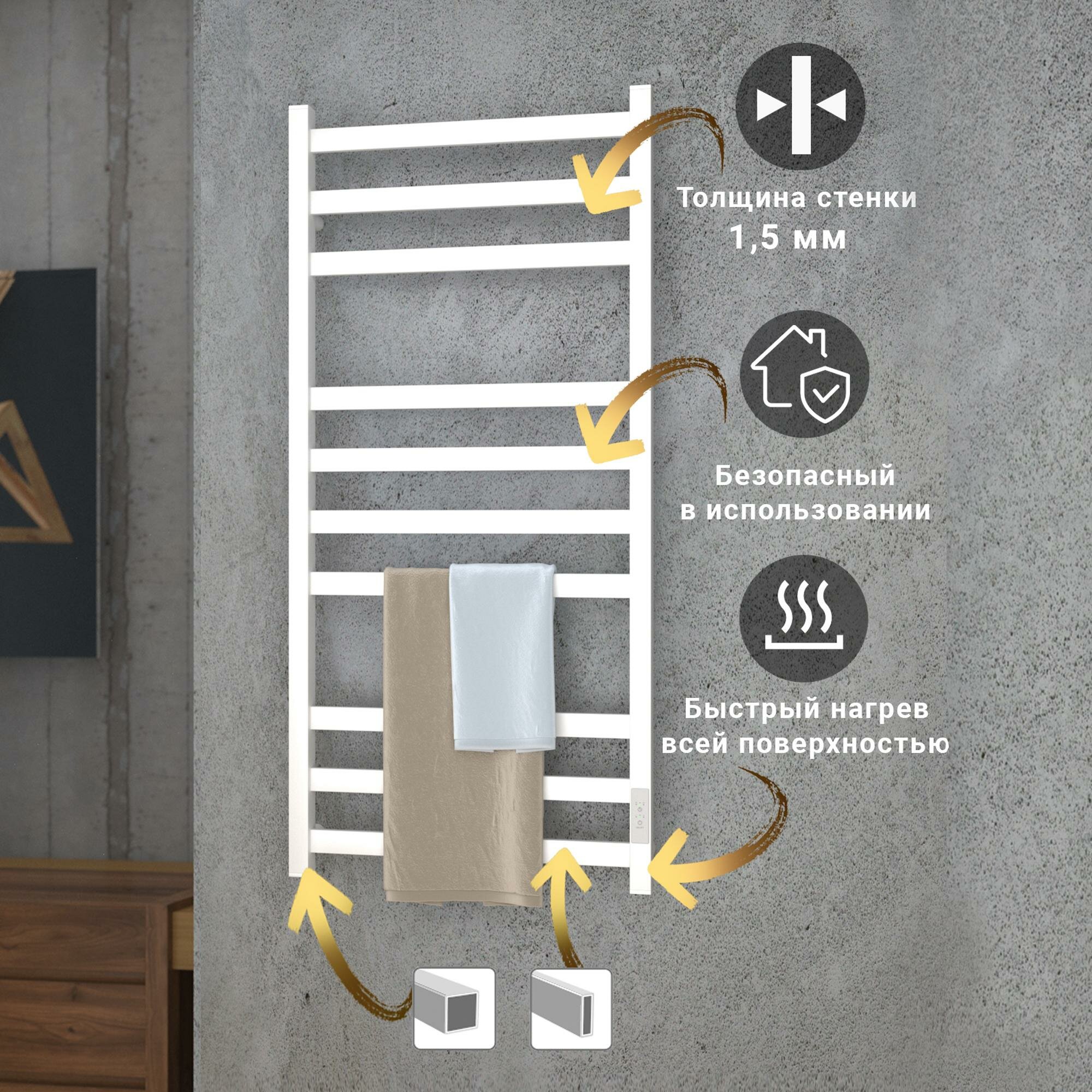 Полотенцесушитель дизайнерский электрический, профильный BAU Stella 8х80, 2 коллектора, 3 крючка (Белый DB-0071)