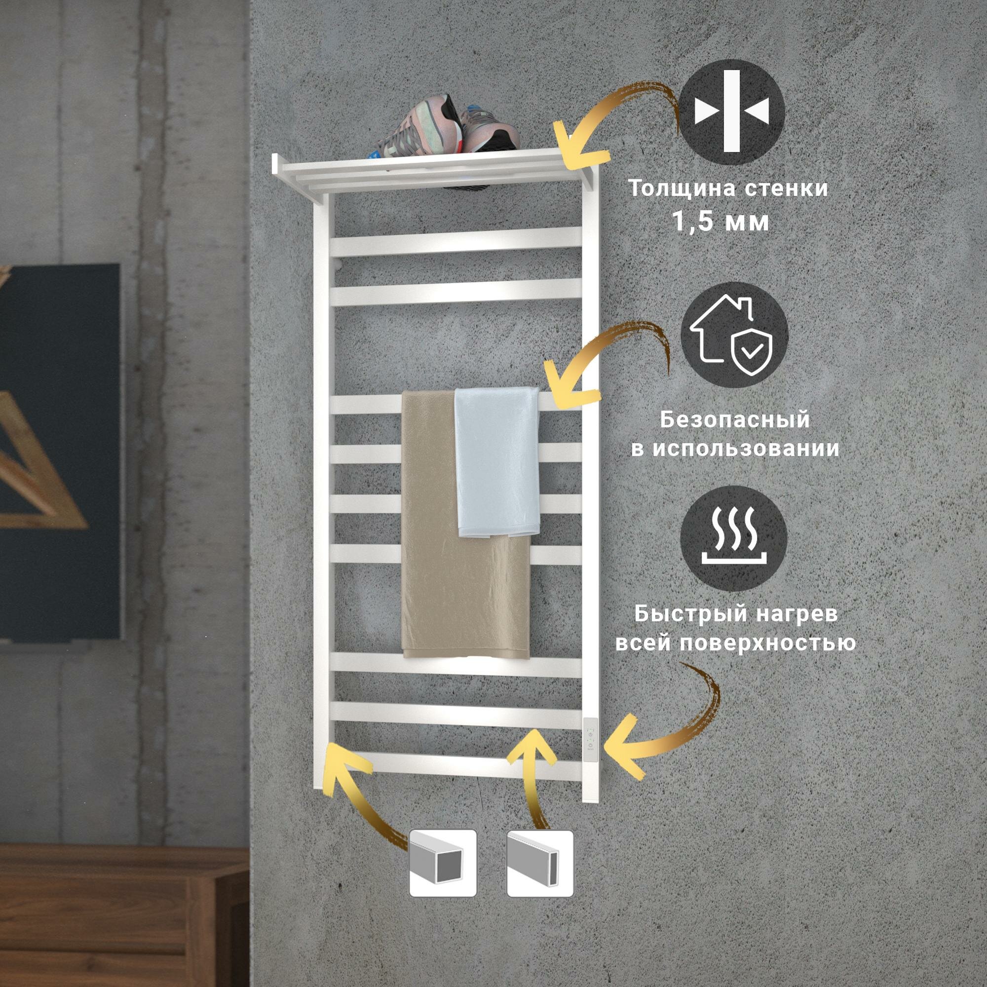 Полотенцесушитель дизайнерский электрический, профильный BAU Stella 8х80, 2 коллектора, 3 крючка (Белый DB-0071)