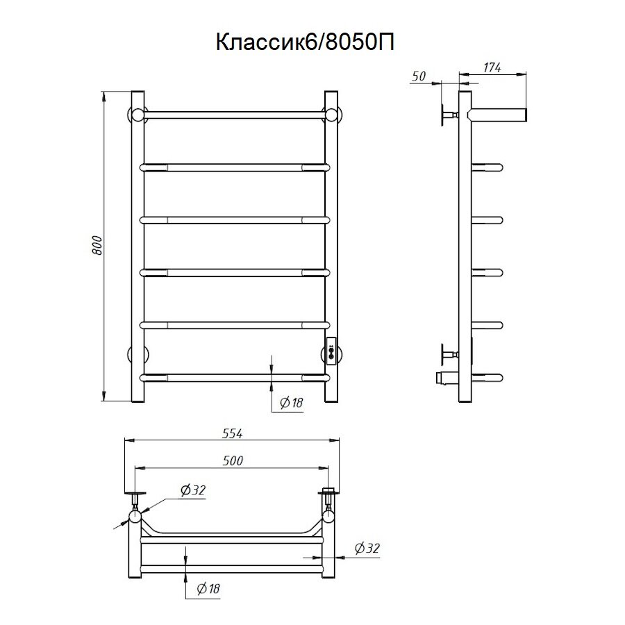 Полотенцесушитель электрический TermoPrime 500мм 800мм форма лесенка с полкой подключение слева / справа/ скрытое/ кабель с вилкой информация: