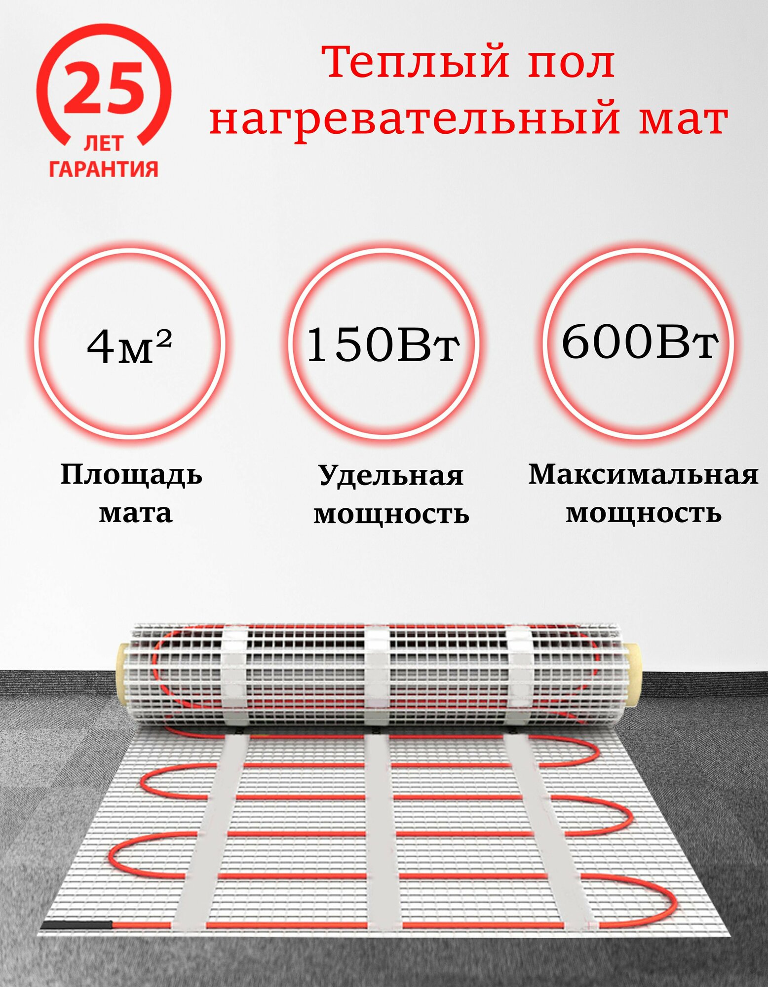 Теплый пол электрический мат нагревательный MrSpeed FHMT / Мощность : 150Вт-600Вт / Размер : 4 м2 информация:
