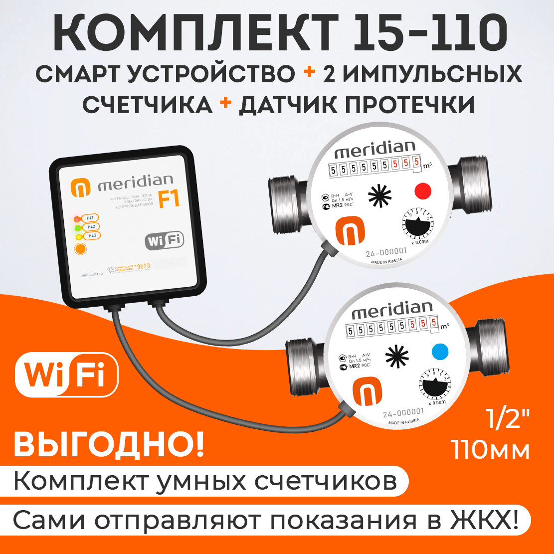 Набор Умные счетчики Meridian для передачи показаний по Wi-Fi (смарт устройство + 2 импульсных счетчика воды 1/2" 110 мм + датчик протечки) информация: