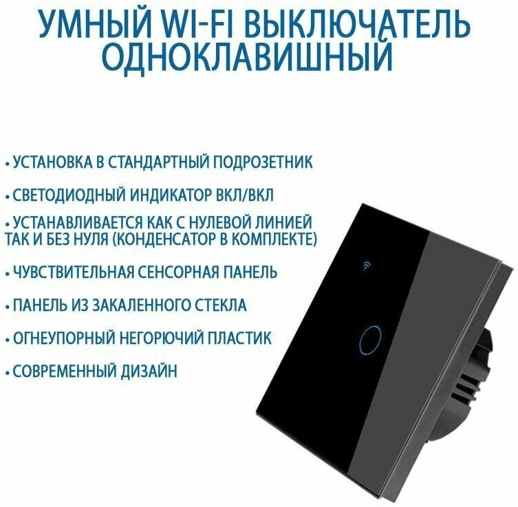 Умный выключатель с Алисой, сенсорный выключатель с Wi-Fi одноклавишный черный, подключение с нулем и без нуля, закаленное стекло информация:
