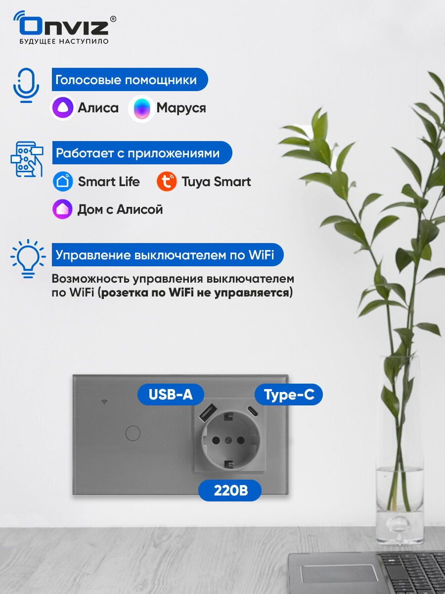 Умный сенсорный Wi-Fi выключатель Tuya(серый) одноклавишный с розеткой USB Type-C - универсальный без нуля и с нулем - работает с Алисой информация: