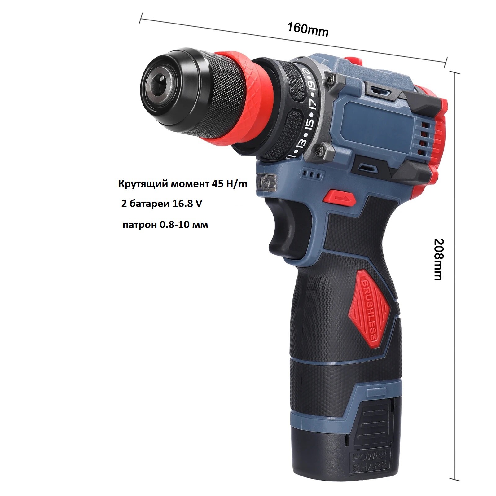 Аккумуляторная дрель-шуруповерт 16,8V со съемным патроном, 45 н/м, бесщеточная информация: