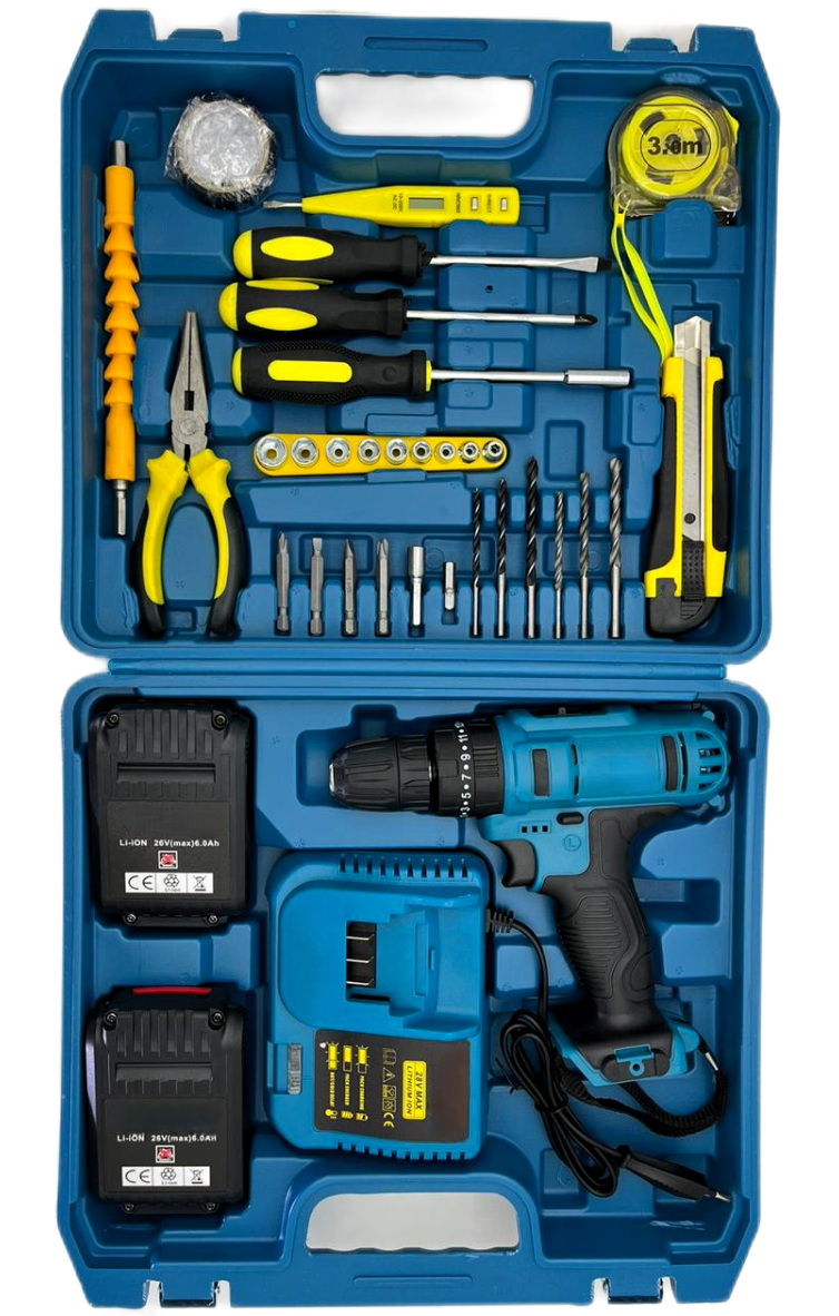 Дрель-шуруповерт ударная/с 2 аккумуляторами 26В/6Ah и комплектом инструментов в кейсе/биты + сверла в комплекте информация: