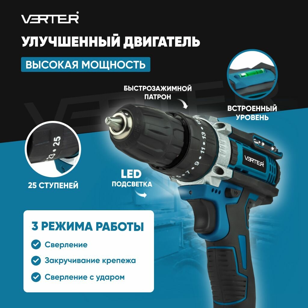 Отзывы на Аккумуляторная дрель-шуруповерт Verter с 2 скоростями и подсветкой, 24 насадки, 21 В, 2 АКБ в кейсе