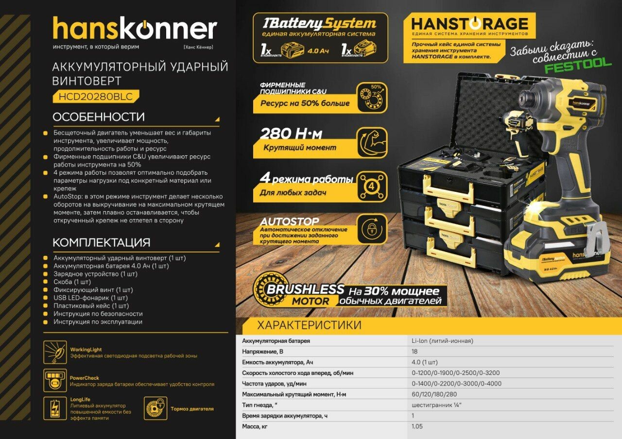 Винтоверт аккумуляторный Hanskonner HCD20280BLC ударный бесщеточный (18В, 1акк*4Ач 1BatterySystem, 280Нм, 4скор, кейсHS)