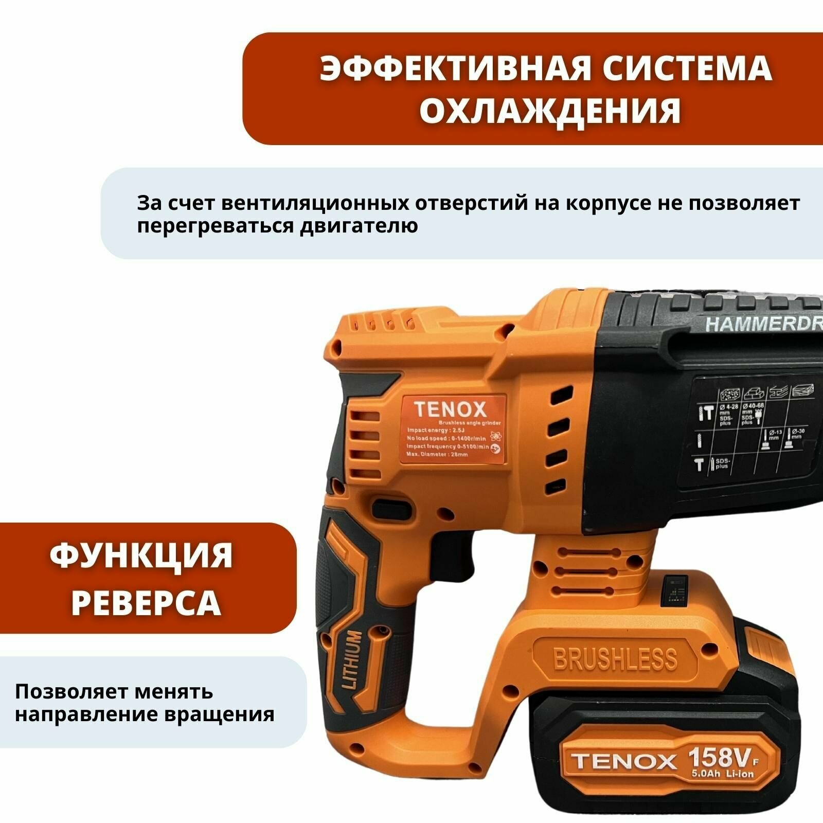 TENOX 158Vf Перфоратор бесщеточный аккумуляторный в кейсе, 21 В, 2,5 Дж, 2 АКБ LI-ION 5 Ач, SDS Plus информация: