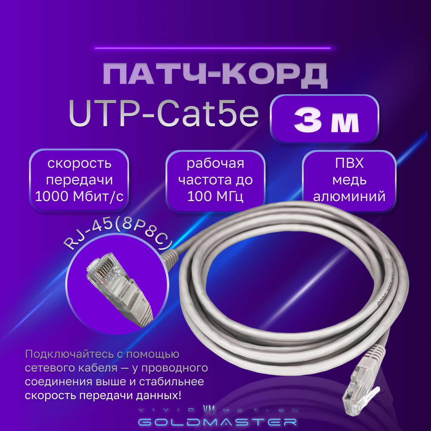 Патч корд 3 м Голд Мастер UTP 5е RJ45 интернет кабель 3 метра LAN сетевой Ethernet патчкорд серый (NA102--3M), контакты blade с позолотой 03FU информация: