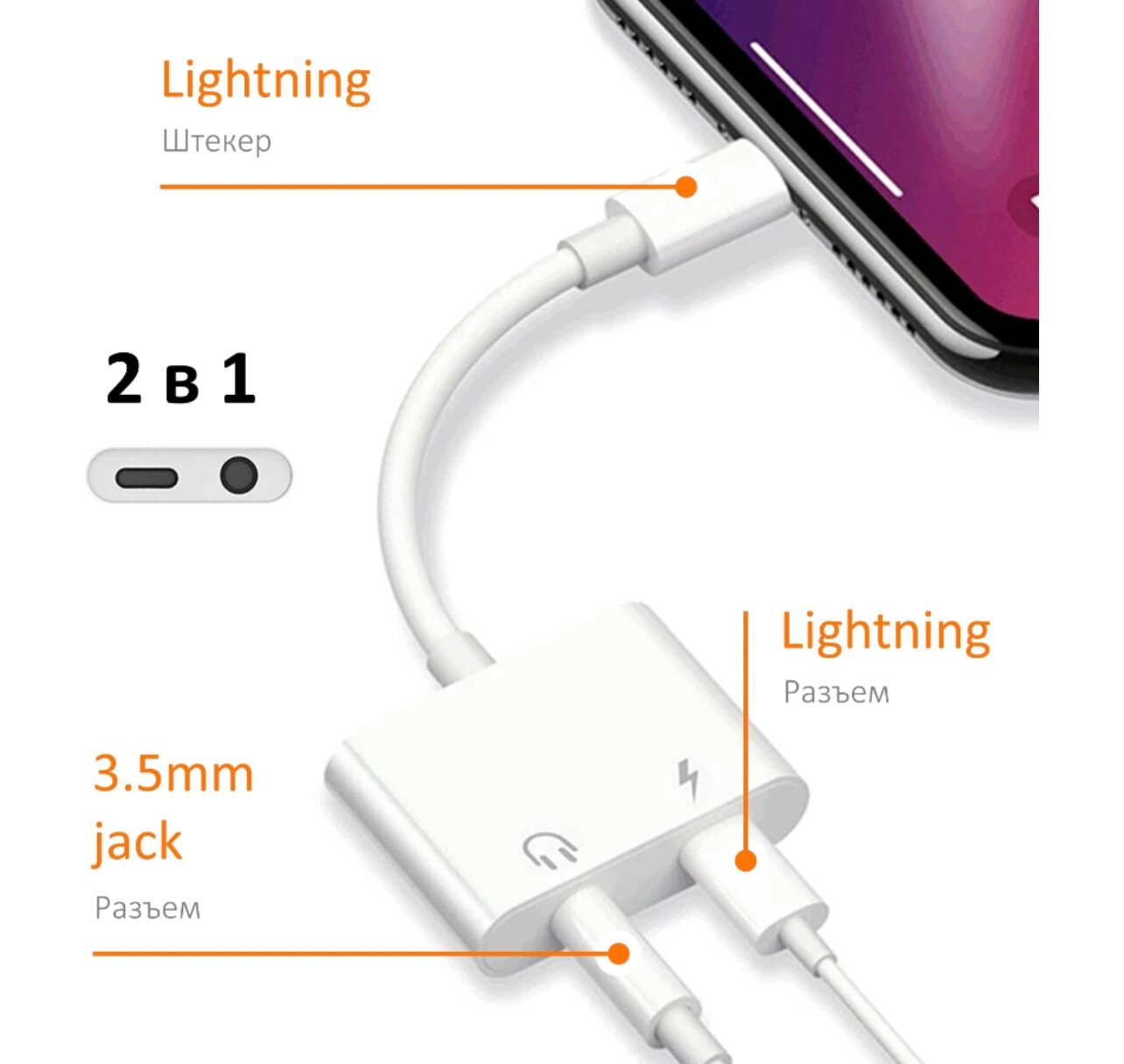 Отзывы на Адаптер, переходник разветвитель Lightning - Lightning/3,5 мм, 10 см, белый