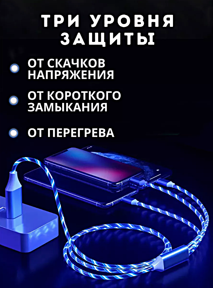 Зарядный кабель светящийся 3 в 1, Зарядный кабель с подсветкой и 3 разъемами MicroUSB, Type-C, Lightning, 120см, Синий 699 ₽
