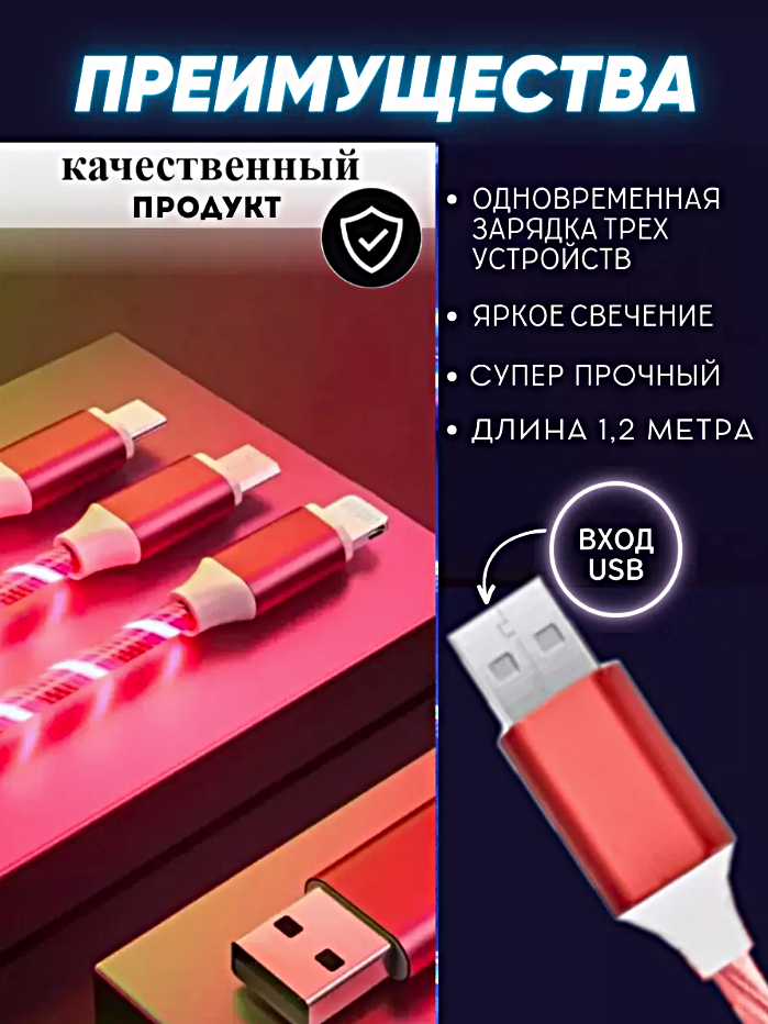 Отзывы на Зарядный кабель светящийся 3 в 1, Зарядный кабель с подсветкой и 3 разъемами MicroUSB, Type-C, Lightning, 120см, Красный