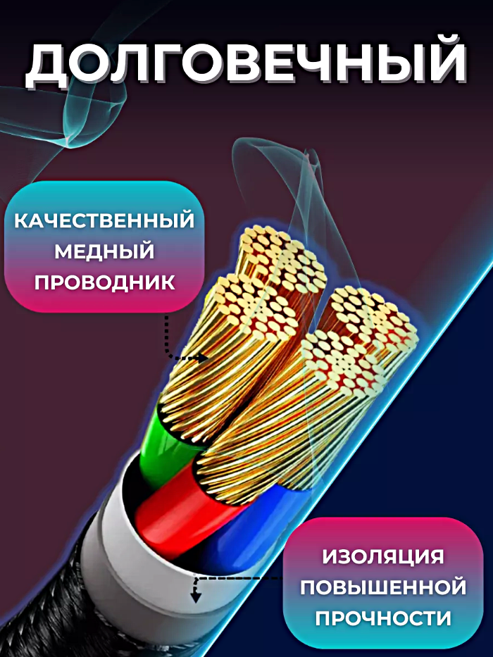 Зарядный кабель светящийся 3 в 1, Зарядный кабель с подсветкой и 3 разъемами MicroUSB, Type-C, Lightning, 120см, Белый-цветной 699 ₽