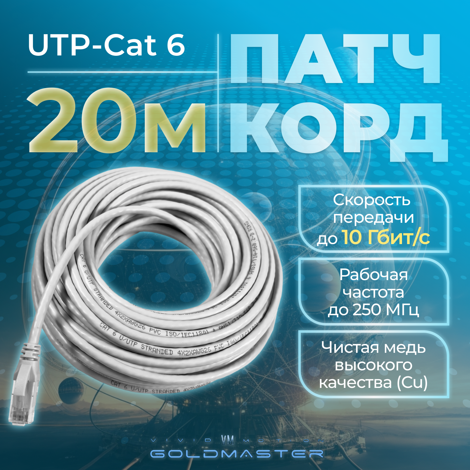 Патч-корд GoldMaster 20м, UTP cat6, медь, RJ45, Ethernet, LAN, серый, NA102-20m, контакты Blade позолота 03MU информация:
