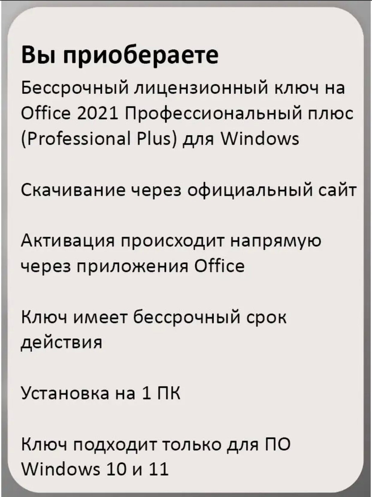 Microsoft Office 2021 Pro Plus ключ активации (На 1 ПК, бессрочная версия) информация: