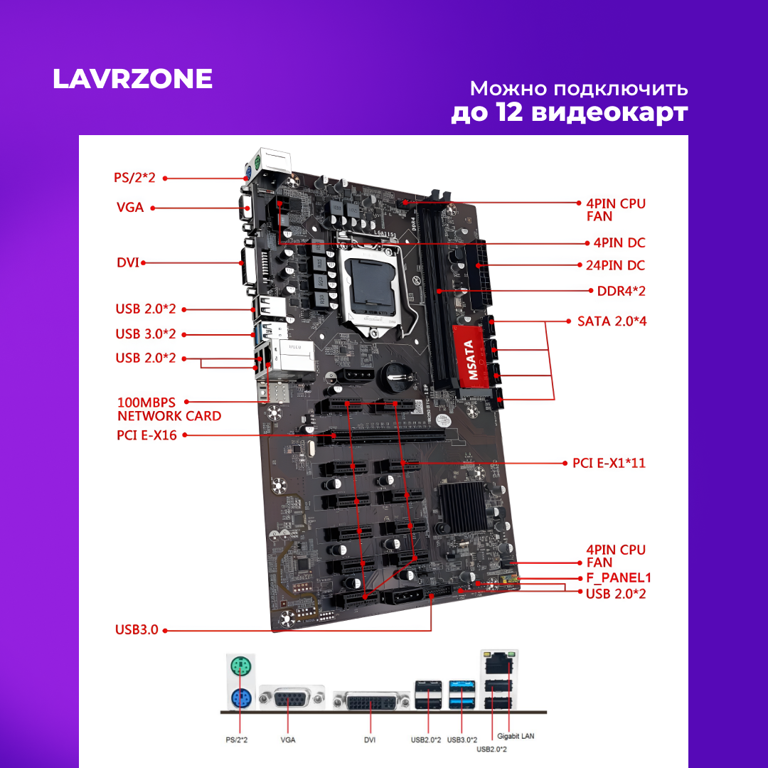 Майнинг комплект LAVRZONE на 12 видеокарт - Материнская плата B250-BTC-GLADIATOR + Процессор Intel Celeron G3900 + ssd 120gb + оперативная память ddr4 + cpu кулер информация:
