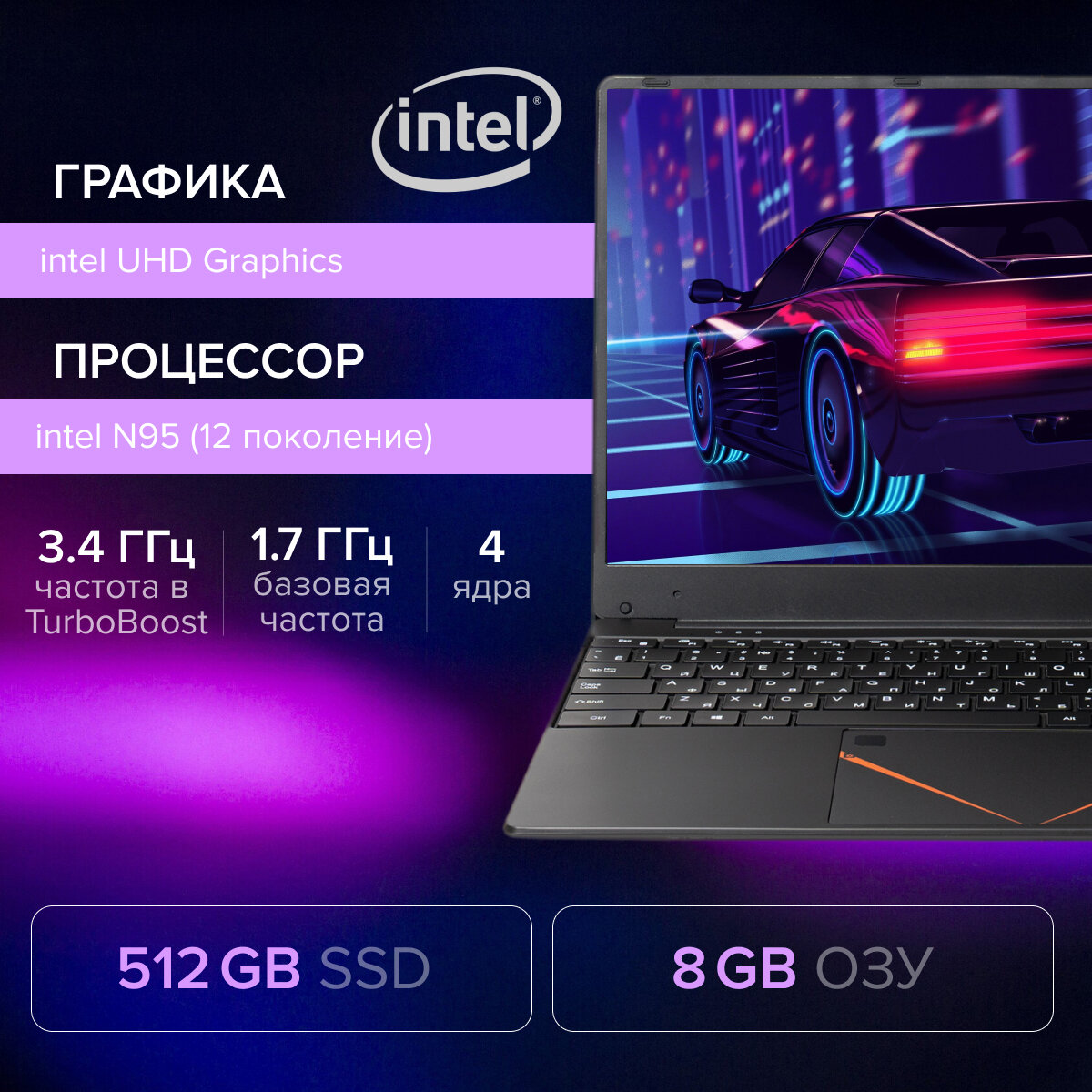 15,6 ноутбук RGB Intel N95 (до 3.4 GHz, 4 ядра), RAM 8 GB, SSD 512 GB, Intel UHD Graphics, RGB клавиатура, Windows 11 Pro информация: