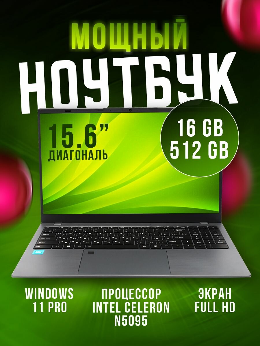 15.1" Ультрабук для работы и учебы, Notebook, RAM 16 ГБ, SSD 1ТБ, IPS Full HD 1920x1080, Intel N5095, Windows 11 pro, цвет Mid Gray, русская раскладка