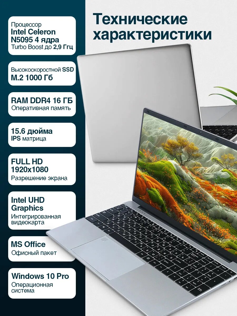 Cтильный ноутбук игровой процессор intel N5095 (2.60 GHz, 4 ядра) / RAM DDR4 16 GB/ NAND FLASH 1000 GB/ 15.6 inch/ Widows 10 Pro информация: