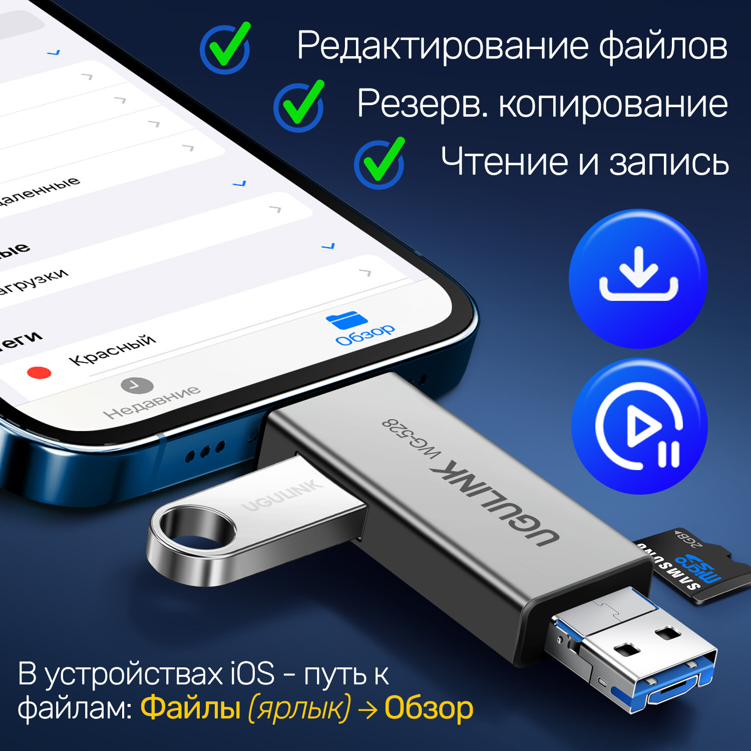 Отзывы на Универсальный Адаптер OTG Картридер 6 в1 для SD + MicroSD / TF карт и USB диск, три выхода Lightning + USB 3.0 + microUSB, UGULINK WG-528