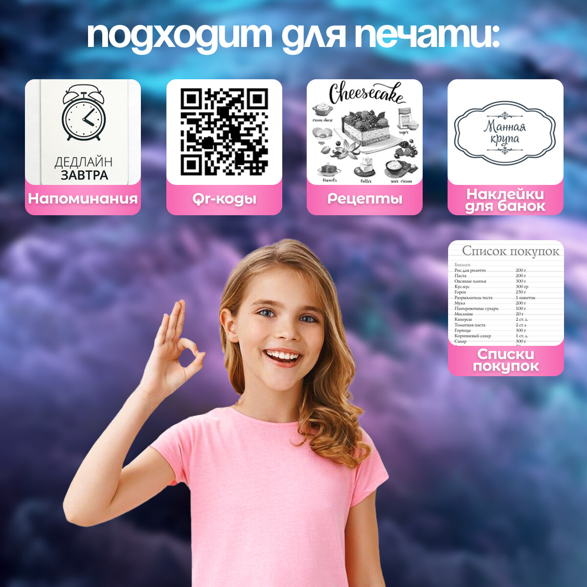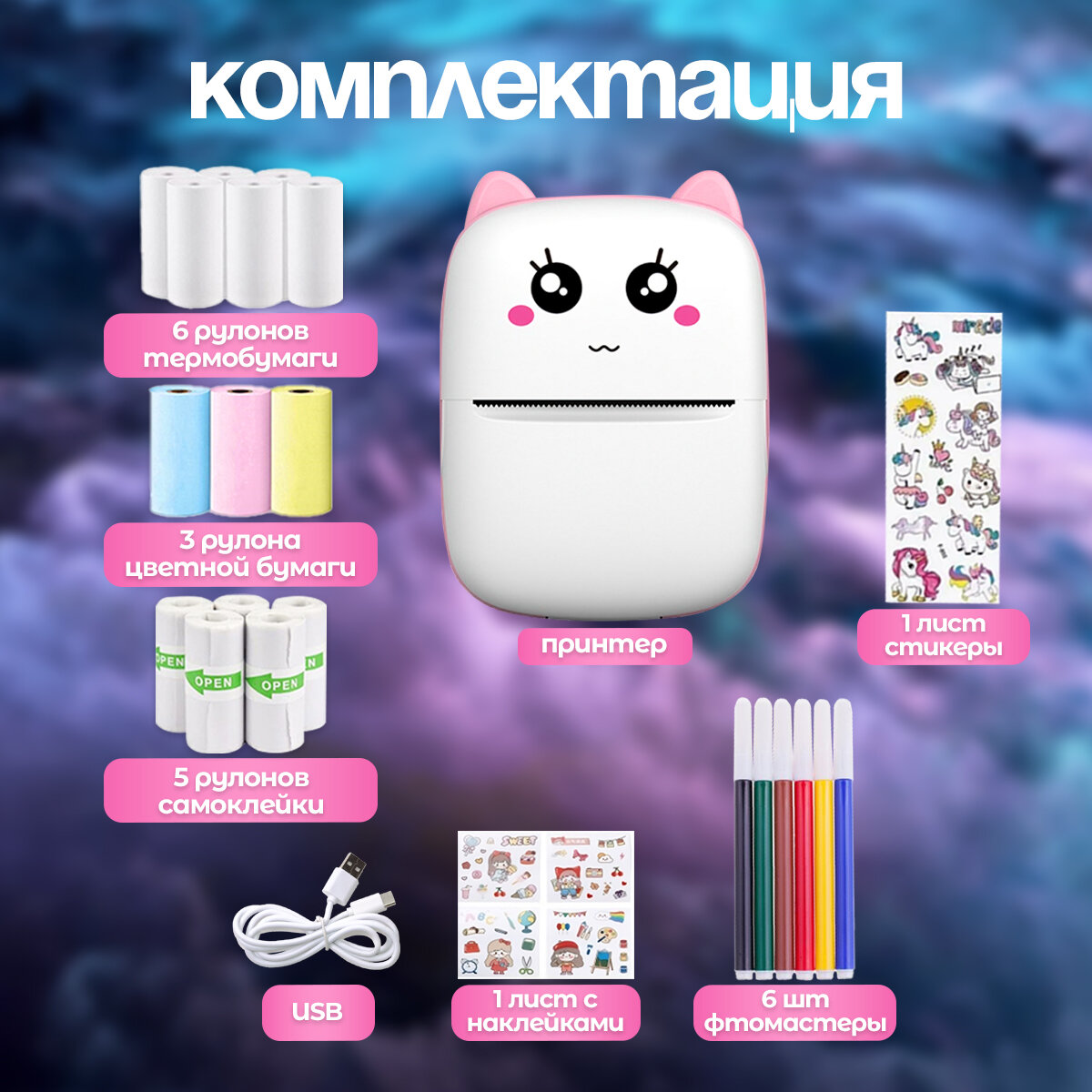 | Комплектация | мини принтер; 6 рулонов термобумаги; 5 рулонов самоклеющейся; 3 рулона цветной; провод USB Type-C; инструкция; 6 маркеров |