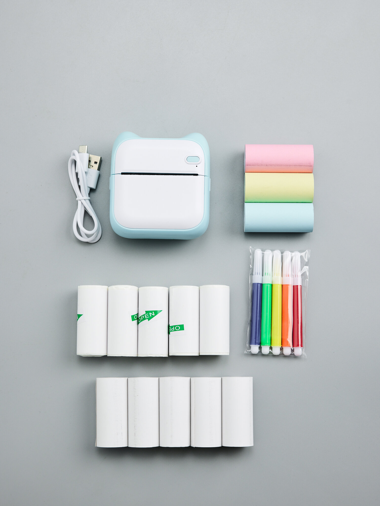 | Комплектация | Беспроводной мини термопринтер; термобумага 6 рулонов; самоклеящаяся бумага 5 рулонов; цветная бумага 3 рулона; USB кабель, инструкция, фломастеры |