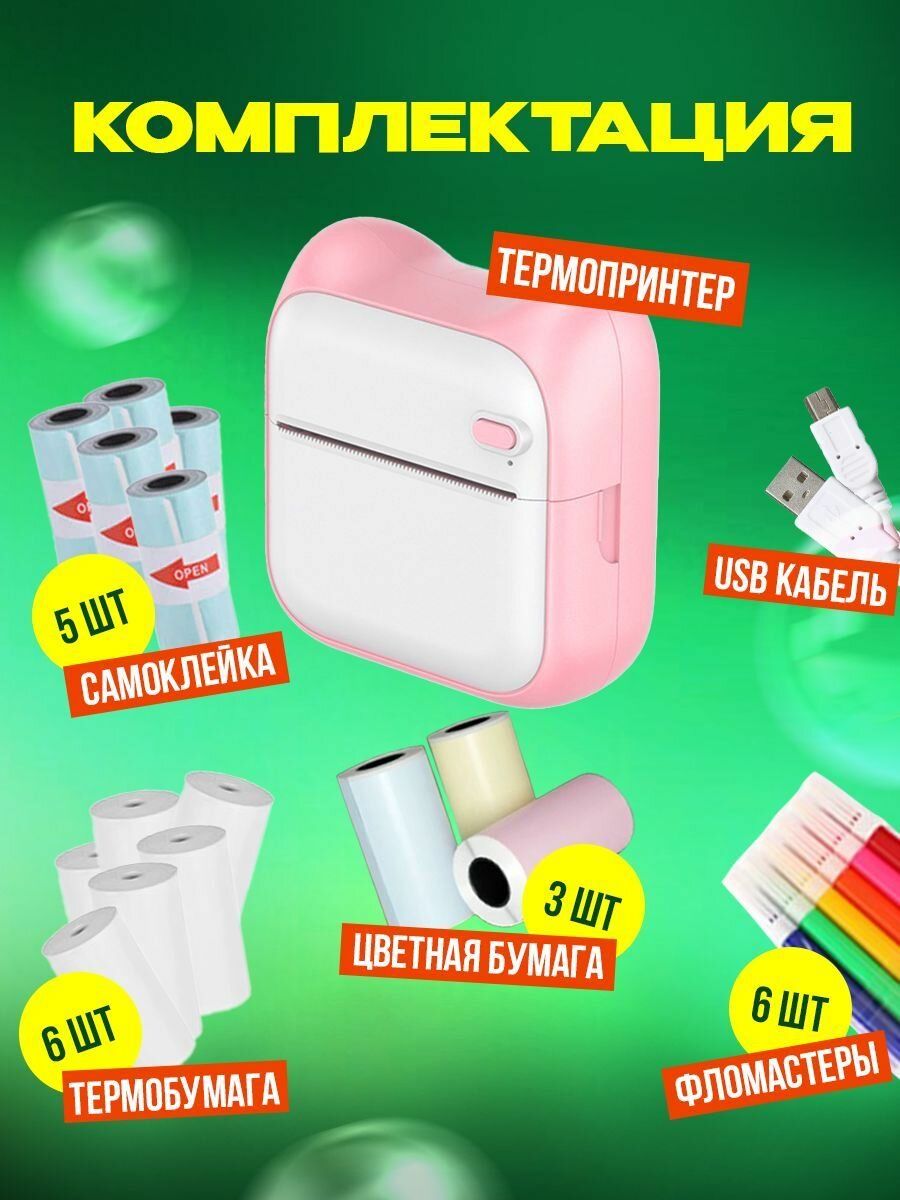 | Комплектация | Принтер 1 шт , бумага для печати белая 6 рулонов , бумага для печати самоклеящаяся 5 рулонов , Бумага для печати цветная 3 рулона , маркеры цветные 6 шт , провод для зарядки 1 шт |