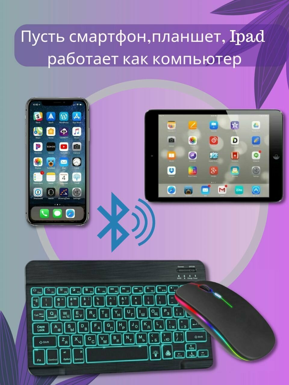 Клавиатура и мышь мини беспроводная Bluetooth с подсветкой Android IOS Windows черная информация:
