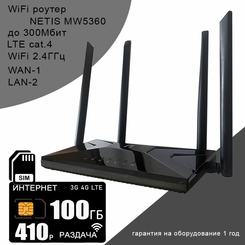 WiFi роутер NETIS MW5360 + сим карта с интернетом и раздачей 100ГБ за 410р/мес. информация: