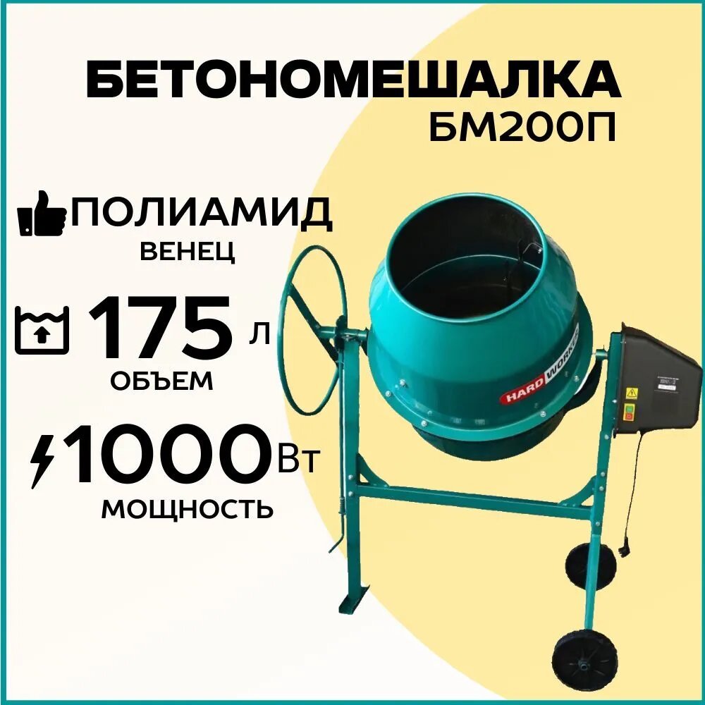 10 цен на Бетономешалка строительная HARD WORKER БМ200П полиамидный венец, объем 175 литров, мощность 1000 Вт, бетоносмеситель электрический