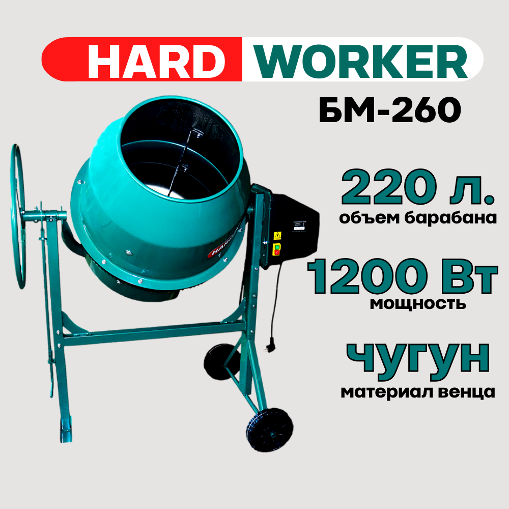 Бетоносмеситель/бетономешалка HARD WORKER БМ260 чугунный венец, объем 220 литров, мощность 1200 Вт информация: