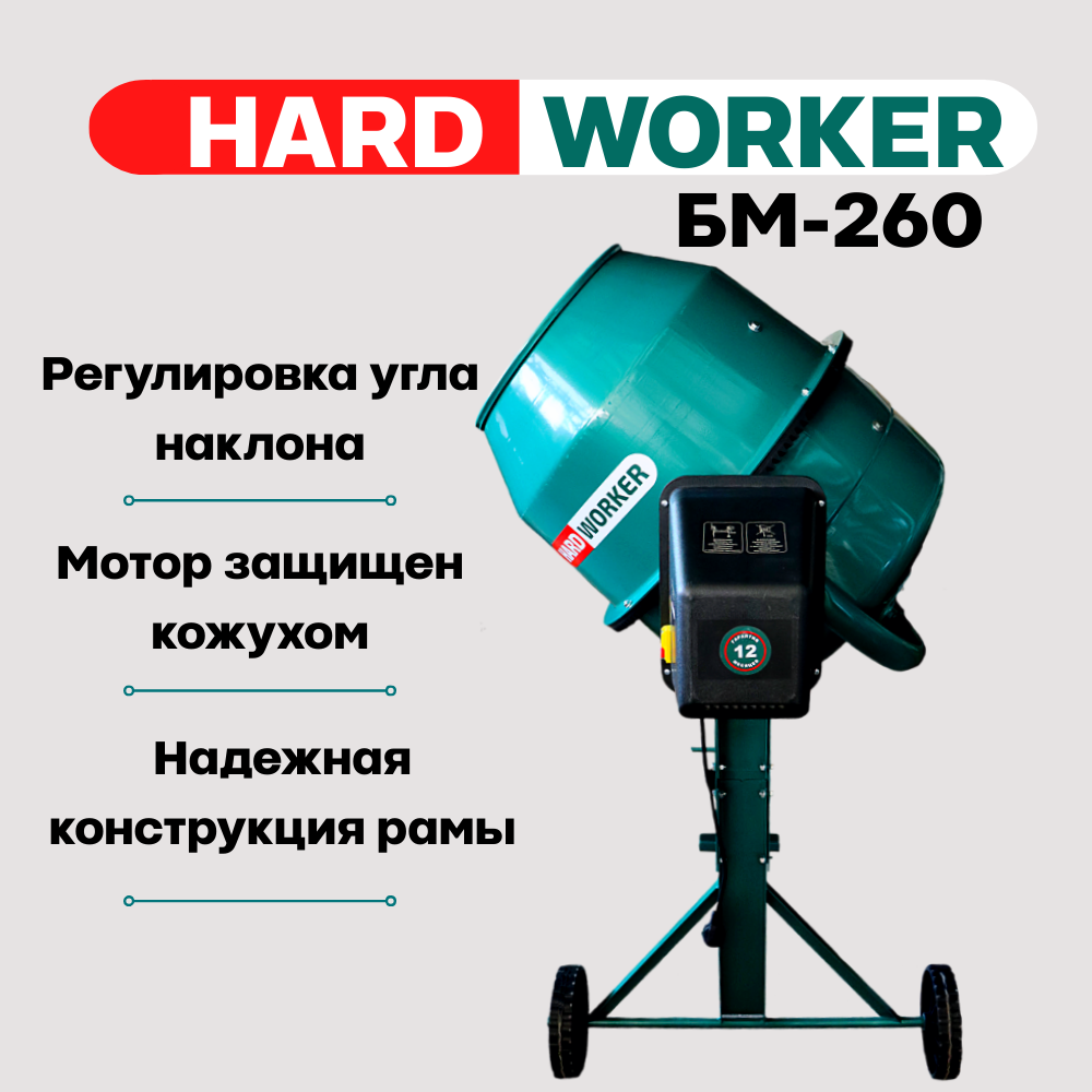 Отзывы на Бетоносмеситель/бетономешалка HARD WORKER БМ260 чугунный венец, объем 220 литров, мощность 1200 Вт