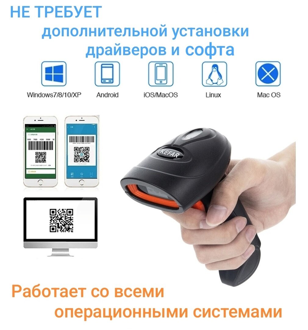 Беспроводной 2D/1D/DM/PDF417 USB сканер штрих кода для ПВЗ, склада, магазинов, маркировки Kefar H4W информация: