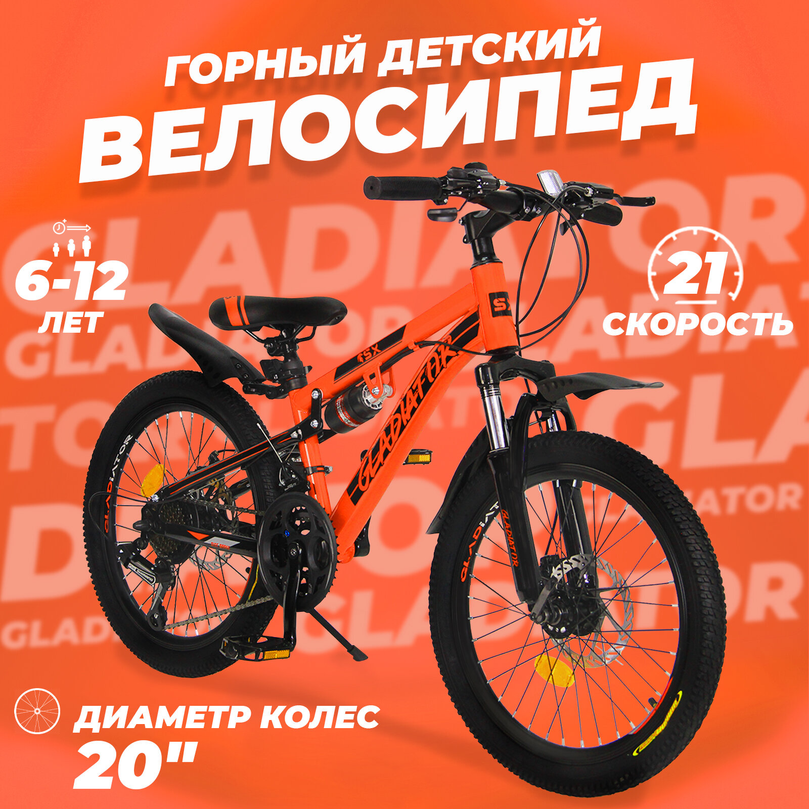 Горный велосипед детский скоростной Gladiator 20" оранжевыйый, 6-12 лет, 21 скорость, 2 амортизатора информация: