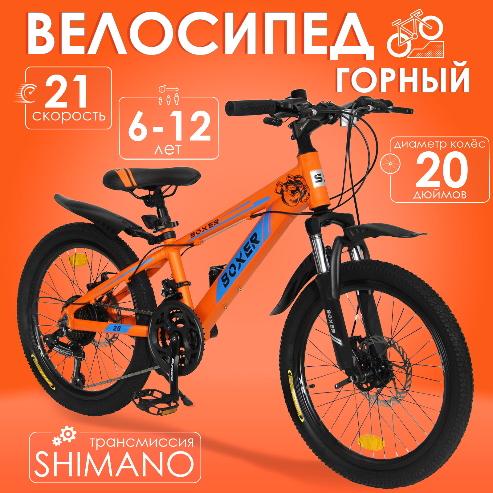 Горный велосипед детский скоростной Boxer 20" оранжевый, 6-12 лет, 21 скорость (Shimano tourney) информация: